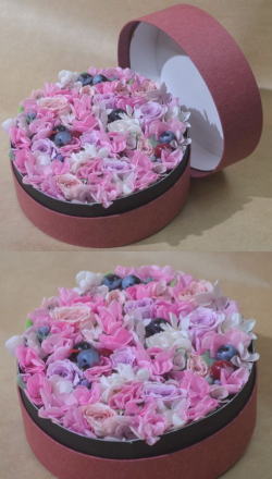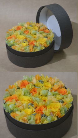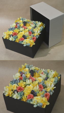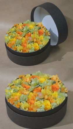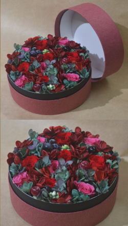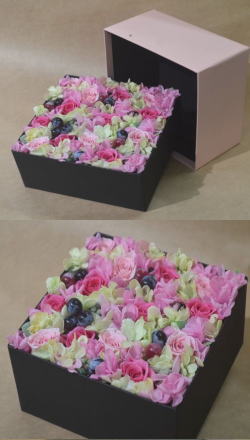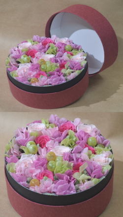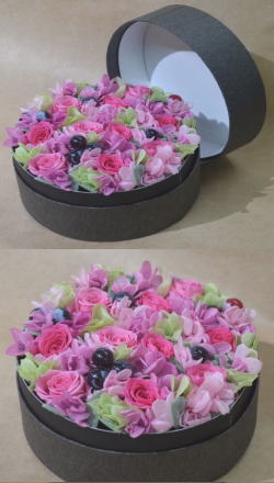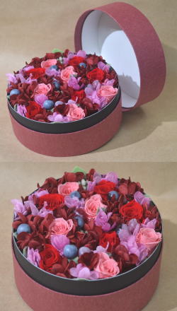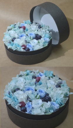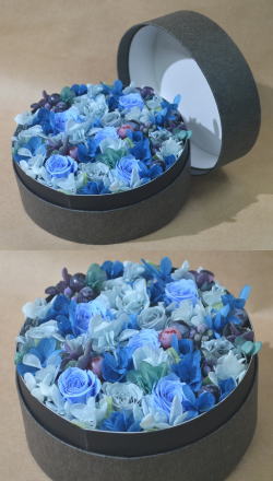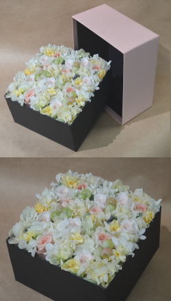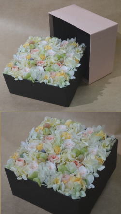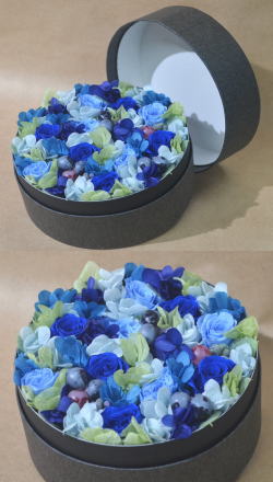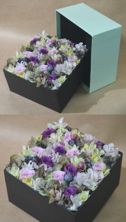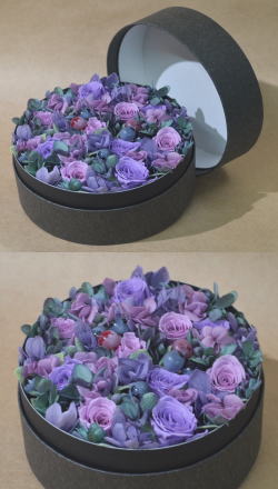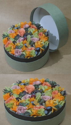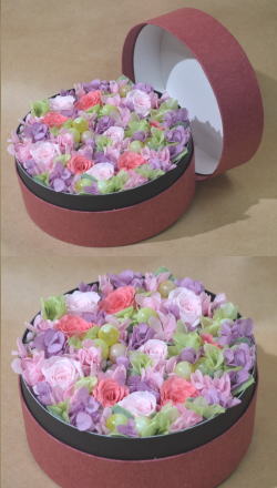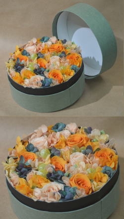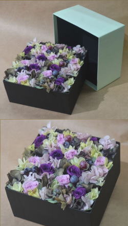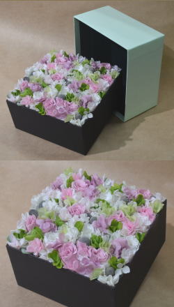 こちらはプリザーブドフラワーとアーティフィシャルフラワー(造花)を使用し、アレンジしています。アレンジにはアロマエッセンスを使用したプリザーブド専用のフレグランスを吹き付けてお届けいたします。