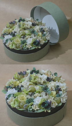 こちらはプリザーブドフラワーとアーティフィシャルフラワー(造花)を使用し、アレンジしています。